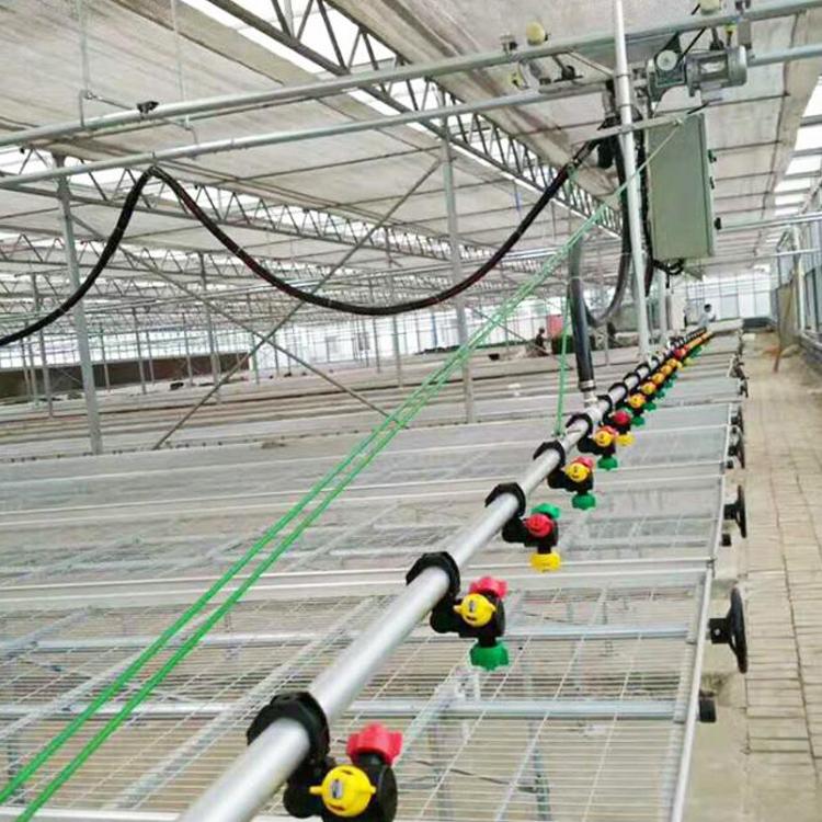 可以選擇使用噴灌機轉移系統(tǒng),噴灌機可以越跨進行灌溉工作,從而用一臺噴灌機完成多跨溫室的灌溉任務,以節(jié)約投資。
